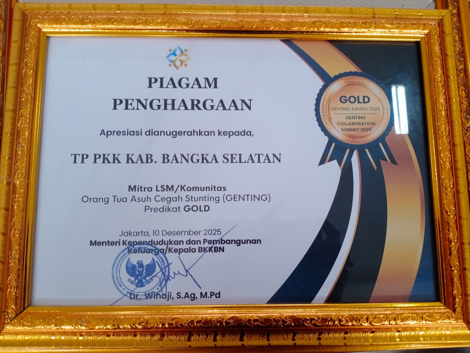 Toboali, Radarnyamuk.com – Tim Penggerak Pemberdayaan dan Kesejahteraan Keluarga (TP PKK) Kabupaten Bangka Selatan kembali menorehkan prestasi membanggakan dengan meraih penghargaan Mitra LSM/Komunitas Orang Tua Asuh Cegah Stunting (GENTING) dengan predikat Gold dari Badan Kependudukan dan Keluarga Berencana Nasional (BKKBN) melalui Perwakilan BKKBN Provinsi Kepulauan Bangka Belitung.
