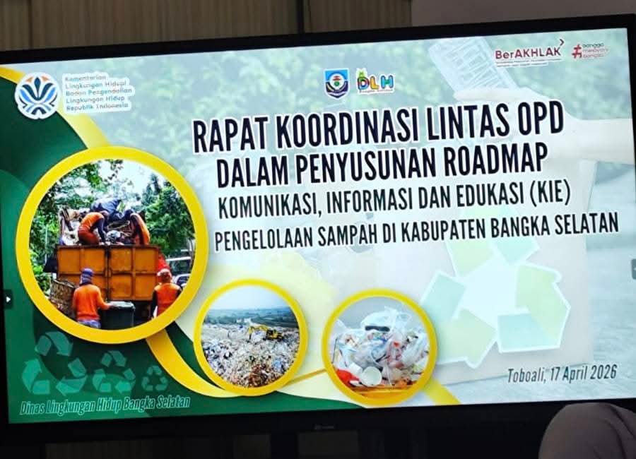 Toboali, Radarnyamuk.com – Pemerintah Kabupaten Bangka Selatan terus memperkuat komitmen dalam pengelolaan sampah melalui pendekatan kolaboratif lintas sektor. Hal ini ditandai dengan digelarnya Rapat Koordinasi (Rakor) lintas Organisasi Perangkat Daerah (OPD) dalam rangka Komunikasi, Informasi, dan Edukasi (KIE) pengelolaan sampah, yang berlangsung di Ruang Studio Perencanaan Pulau Kelapan, Bappelitbangda Bangka Selatan, Jumat (17/4/2026).