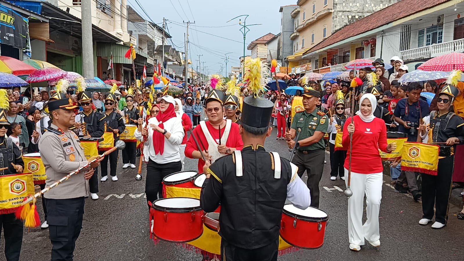 Meski sempat diguyur hujan deras, semangat peserta tidak luntur. Barisan yang kompak, variasi formasi, serta kostum menarik yang ditampilkan membuat ribuan penonton terhibur. Suasana semakin semarak dengan kehadiran para pelaku UMKM yang berjualan di sepanjang rute pawai.