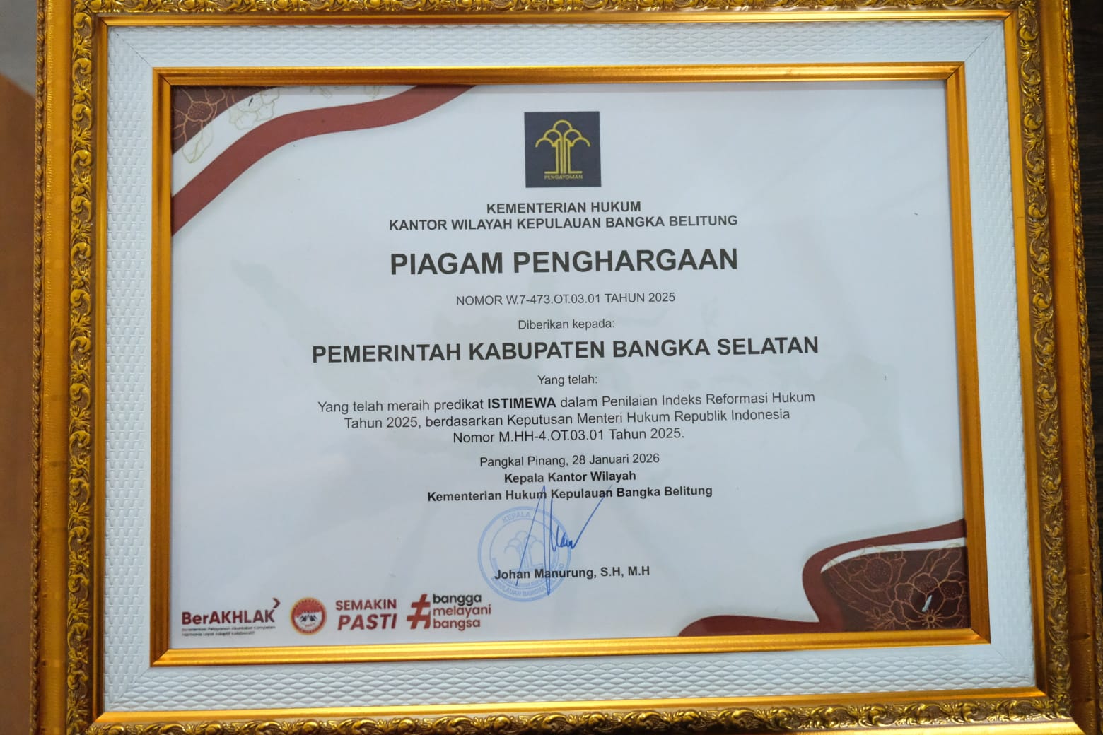 Penghargaan tersebut diberikan berdasarkan Keputusan Menteri Hukum Republik Indonesia Nomor M.HH-4.OT.03.01 Tahun 2025 oleh Kantor Wilayah Kementerian Hukum Kepulauan Bangka Belitung, Kamis (16/4/2026).