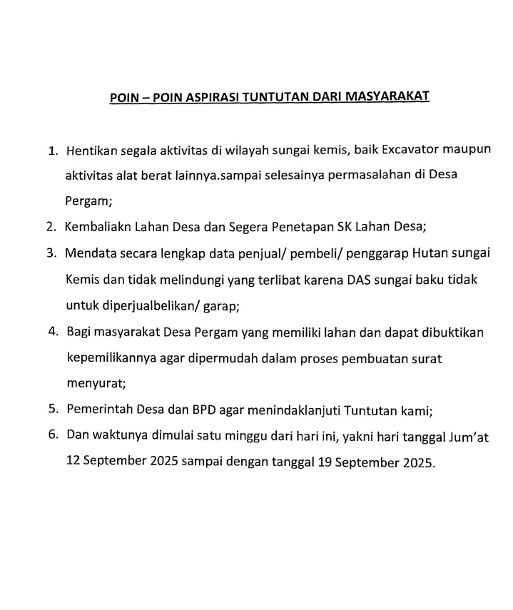 1. Penghentian seluruh aktivitas di wilayah Sungai Kemis, termasuk penggunaan alat berat, sampai permasalahan selesai.