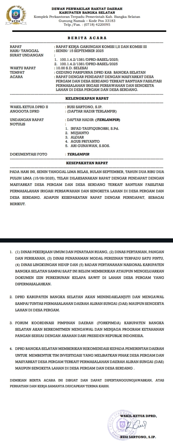 4. DPRD Basel merekomendasikan agar pemerintah daerah segera membentuk tim investigasi yang melibatkan perangkat desa dan masyarakat dari Desa Pergam dan Serdang.