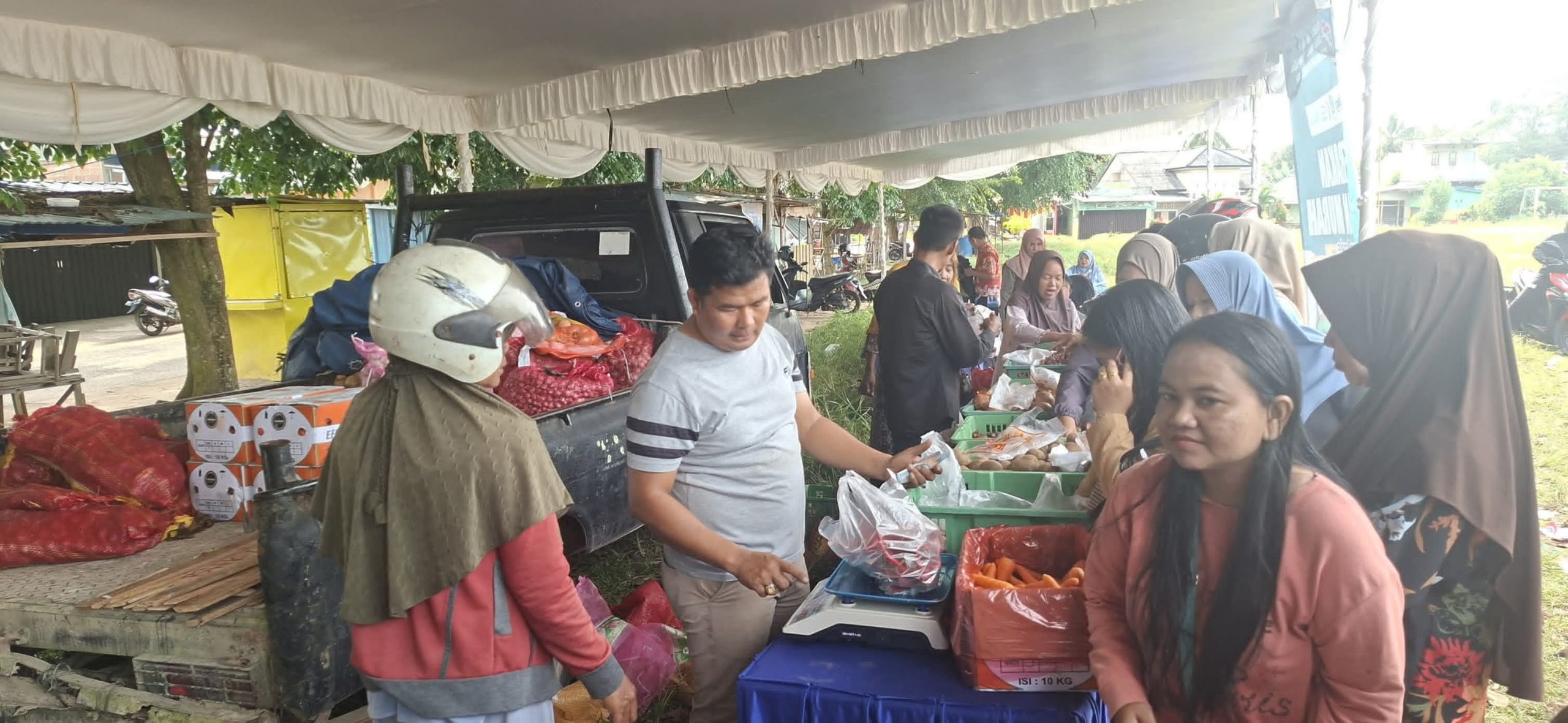 Sejak pagi hari, lapangan telah dipadati warga yang datang untuk membeli berbagai kebutuhan pokok dengan harga terjangkau. Lapak-lapak penjualan ditata berjajar rapi dan menawarkan beragam komoditas pangan strategis seperti beras, gula, minyak goreng, cabai, bawang, kentang, wortel, hingga aneka buah-buahan.