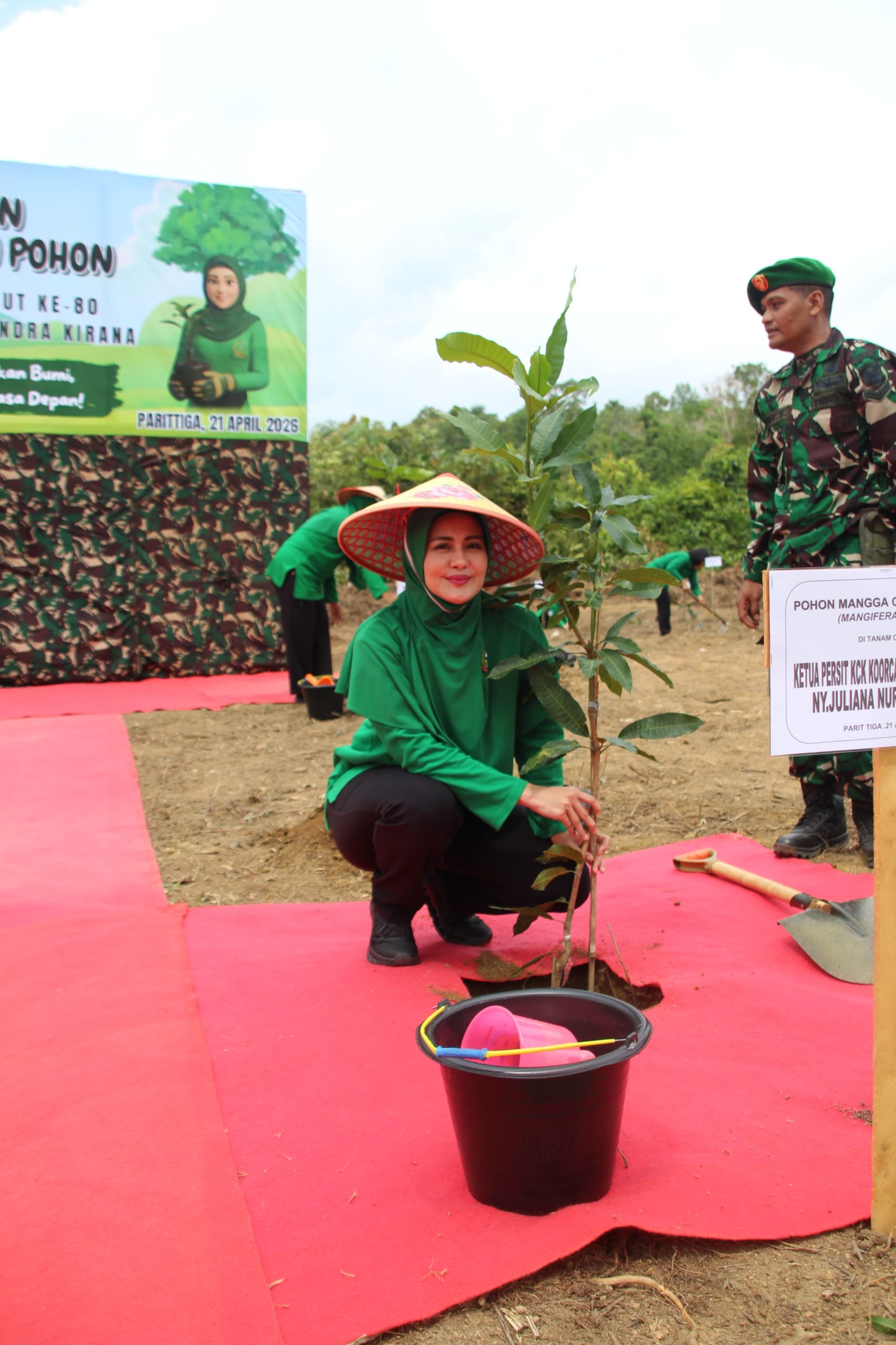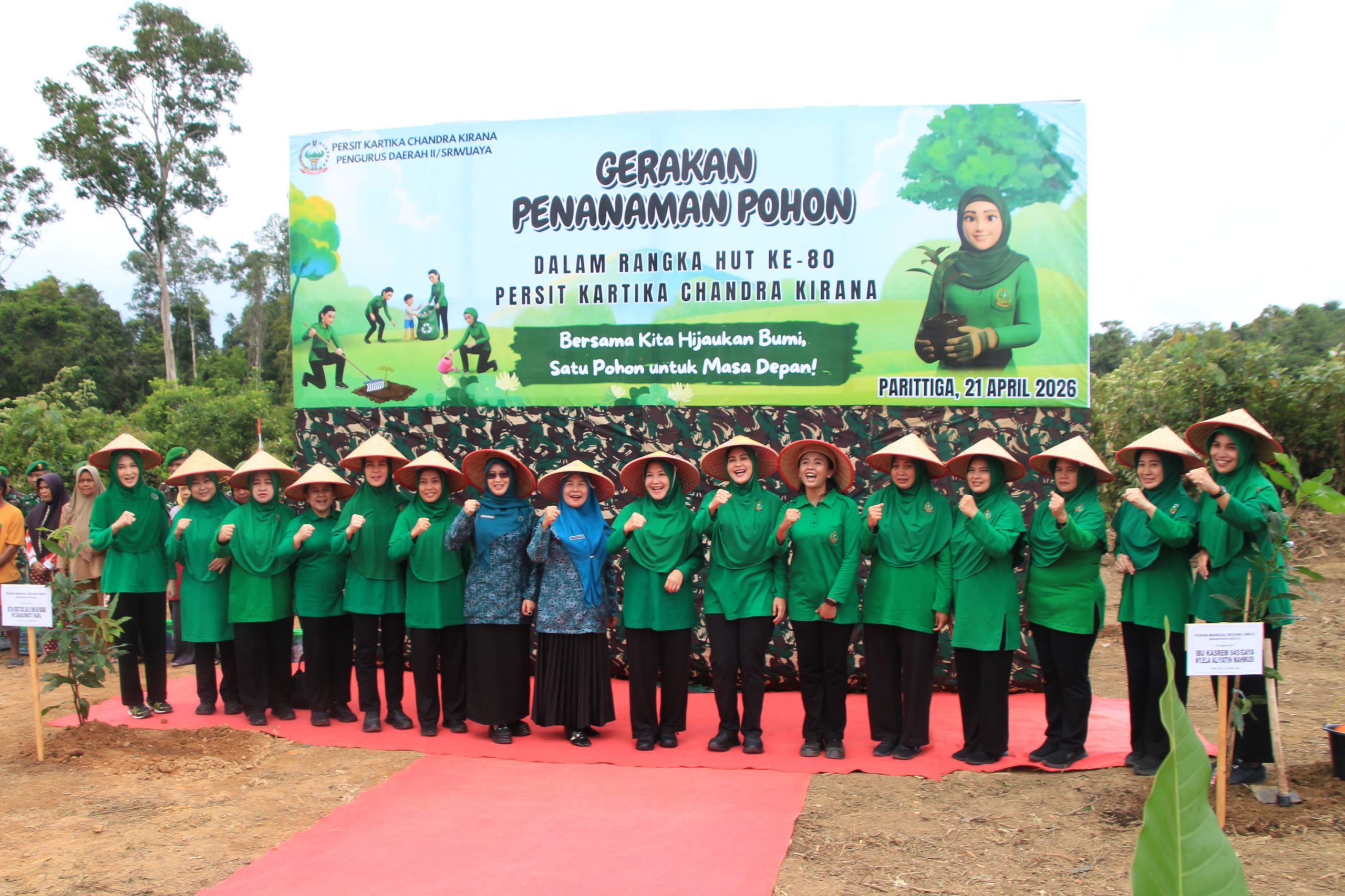 Pada kesempatan yang sama, Ketua Persit Kartika Chandra Kirana (KCK) PD II/Sriwijaya, Desi Elita Ujang Darwis, melaksanakan kegiatan bakti sosial di Desa Air Gantang. Kegiatan ini diwujudkan melalui penanaman sebanyak 500 batang pohon buah-buahan sebagai bentuk kepedulian terhadap pelestarian lingkungan sekaligus mendukung ketahanan pangan masyarakat.