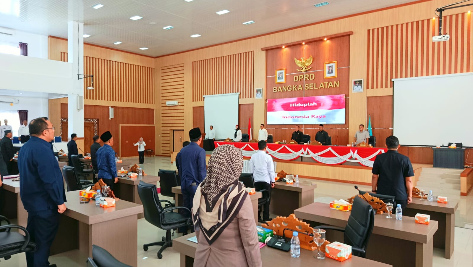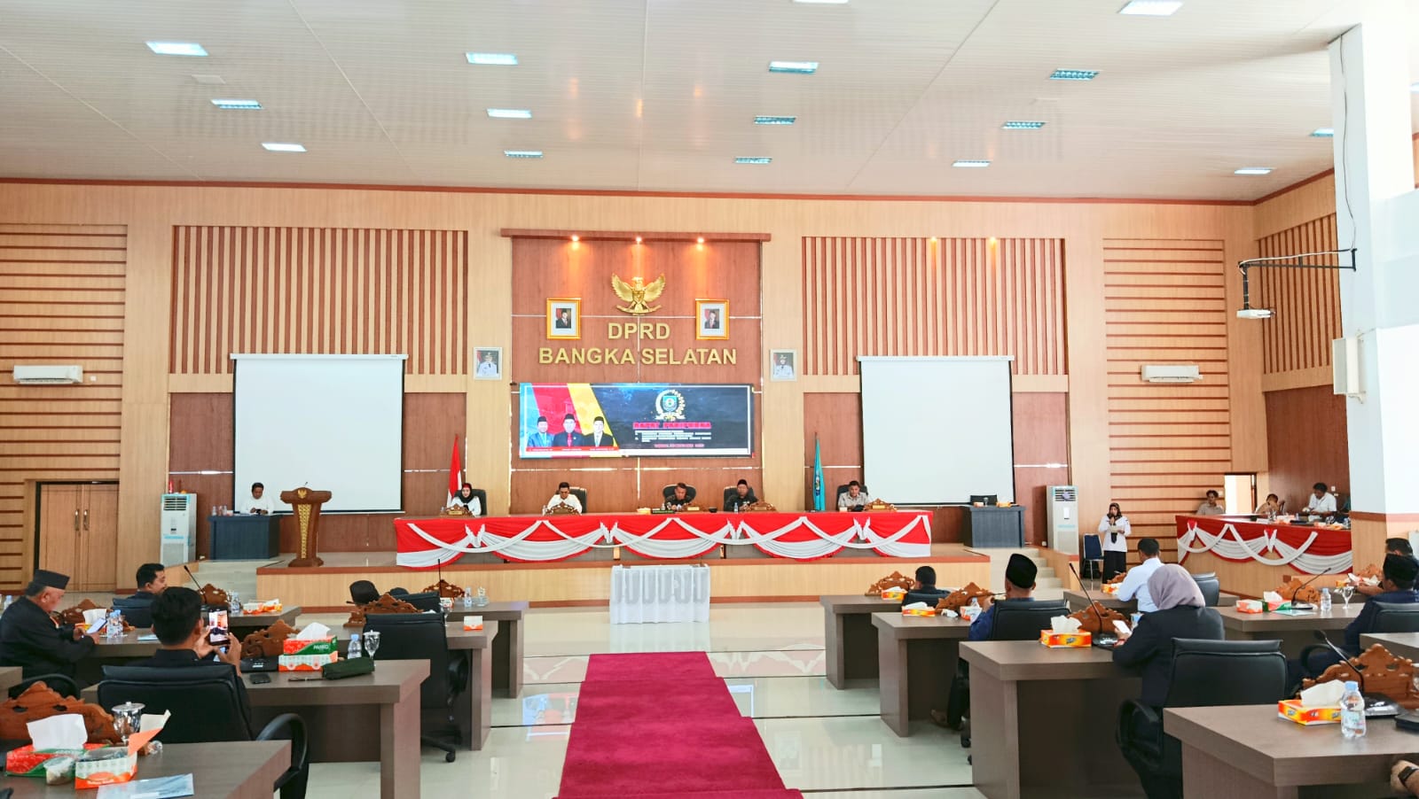 Rapat Paripurna tersebut dipimpin langsung oleh Ketua DPRD Kabupaten Bangka Selatan dan dihadiri oleh Bupati Bangka Selatan H. Riza Herdavid, S.T., M.Tr.IP., Wakil Bupati Bangka Selatan Hj. Debby Vita Dewi, S.E., M.M., pimpinan dan seluruh anggota DPRD, unsur Forum Koordinasi Pimpinan Daerah (Forkopimda), staf ahli, tenaga ahli, para kepala Organisasi Perangkat Daerah (OPD), serta camat di lingkungan Pemerintah Kabupaten Bangka Selatan.