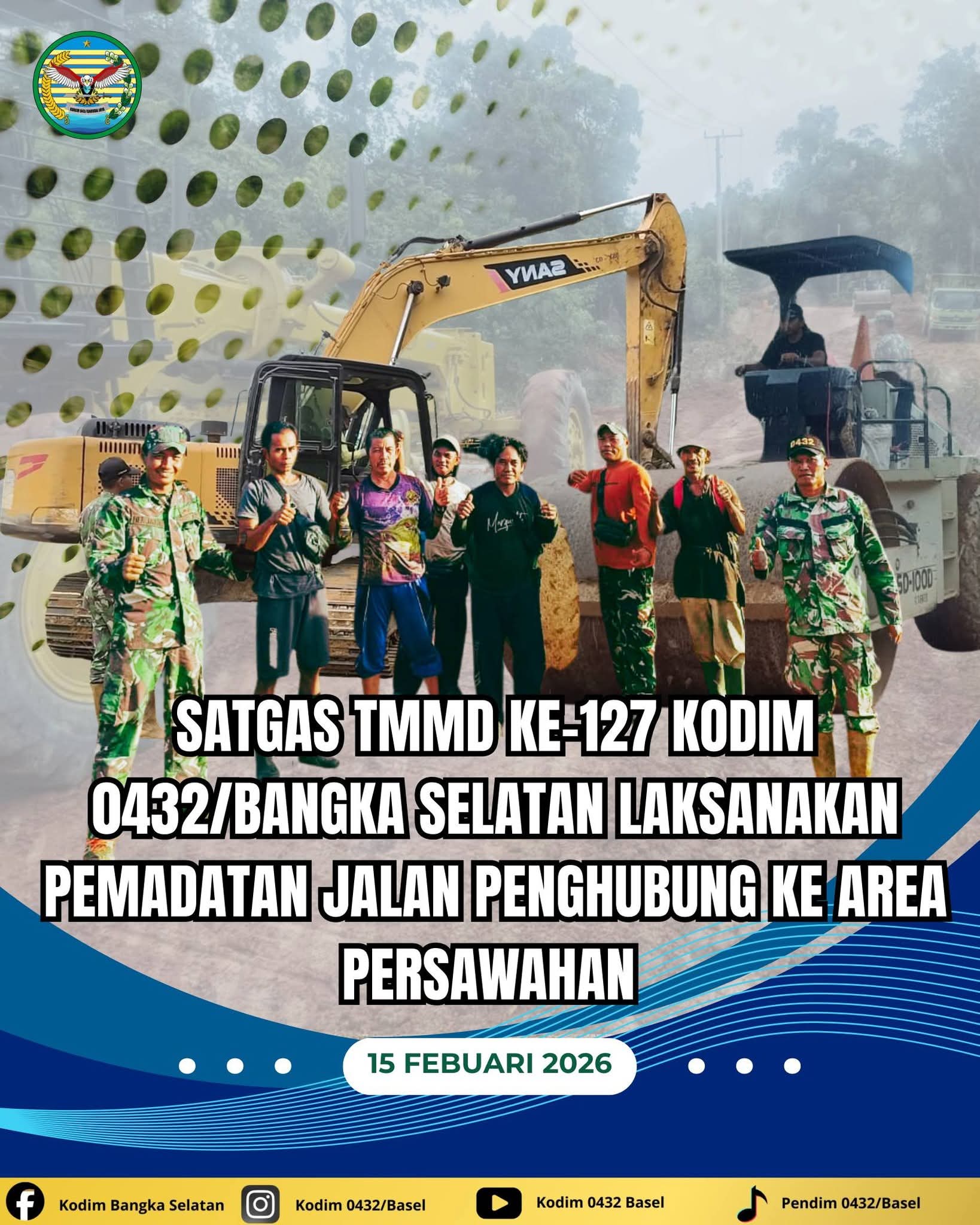 BANGKA SELATAN, Radarnyamuk.com ,– Program TNI Manunggal Membangun Desa (TMMD) Ke-127 TA 2026 yang dilaksanakan jajaran Kodim 0432/Bangka Selatan terus menunjukkan progres signifikan. Salah satu sasaran fisik berupa pembangunan jalan penghubung antar dusun sepanjang 5,5 kilometer di Desa Penutuk kini memasuki tahap pemadatan badan jalan, Minggu (15/02/2026).