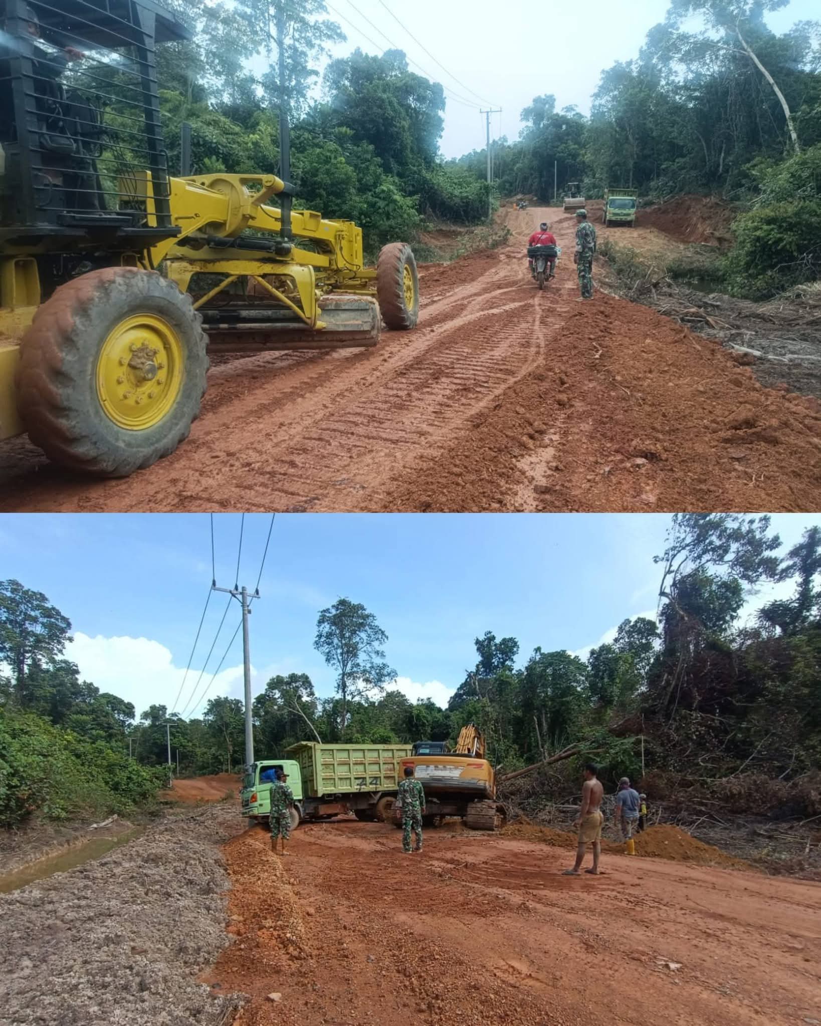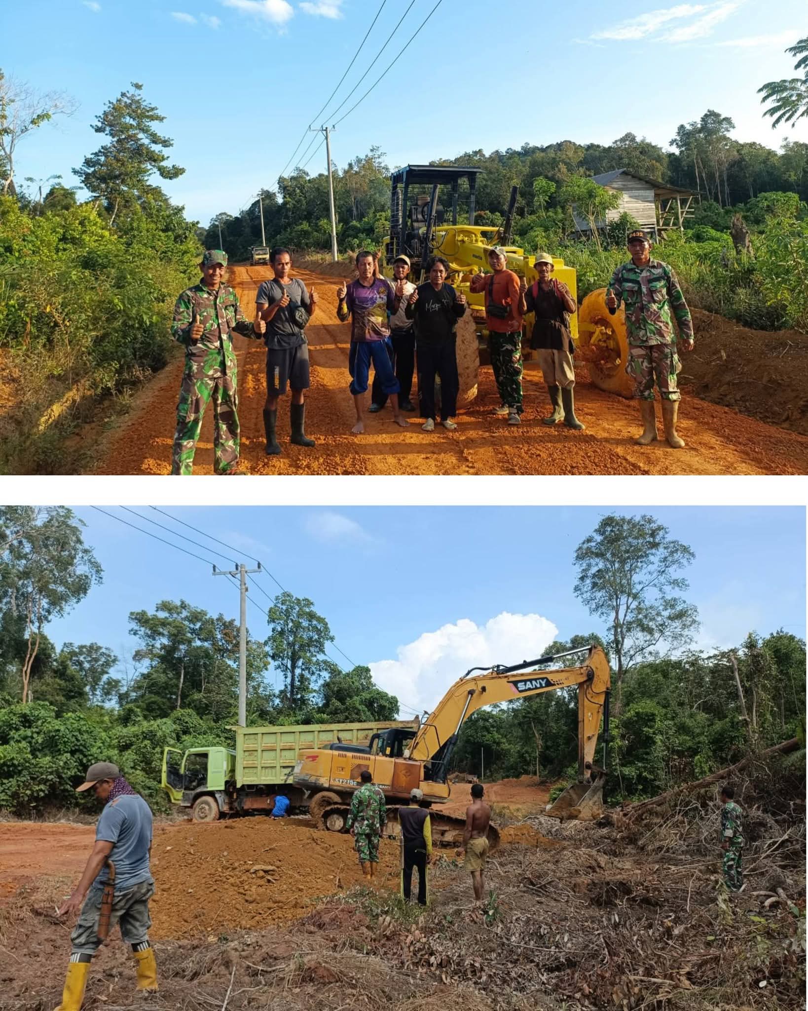 Pengawas lapangan, Sertu Herjanu, menyampaikan bahwa setelah dilakukan perataan dan penimbunan menggunakan tanah puru, tahap selanjutnya adalah pemadatan badan jalan agar konstruksi lebih kuat dan rata.