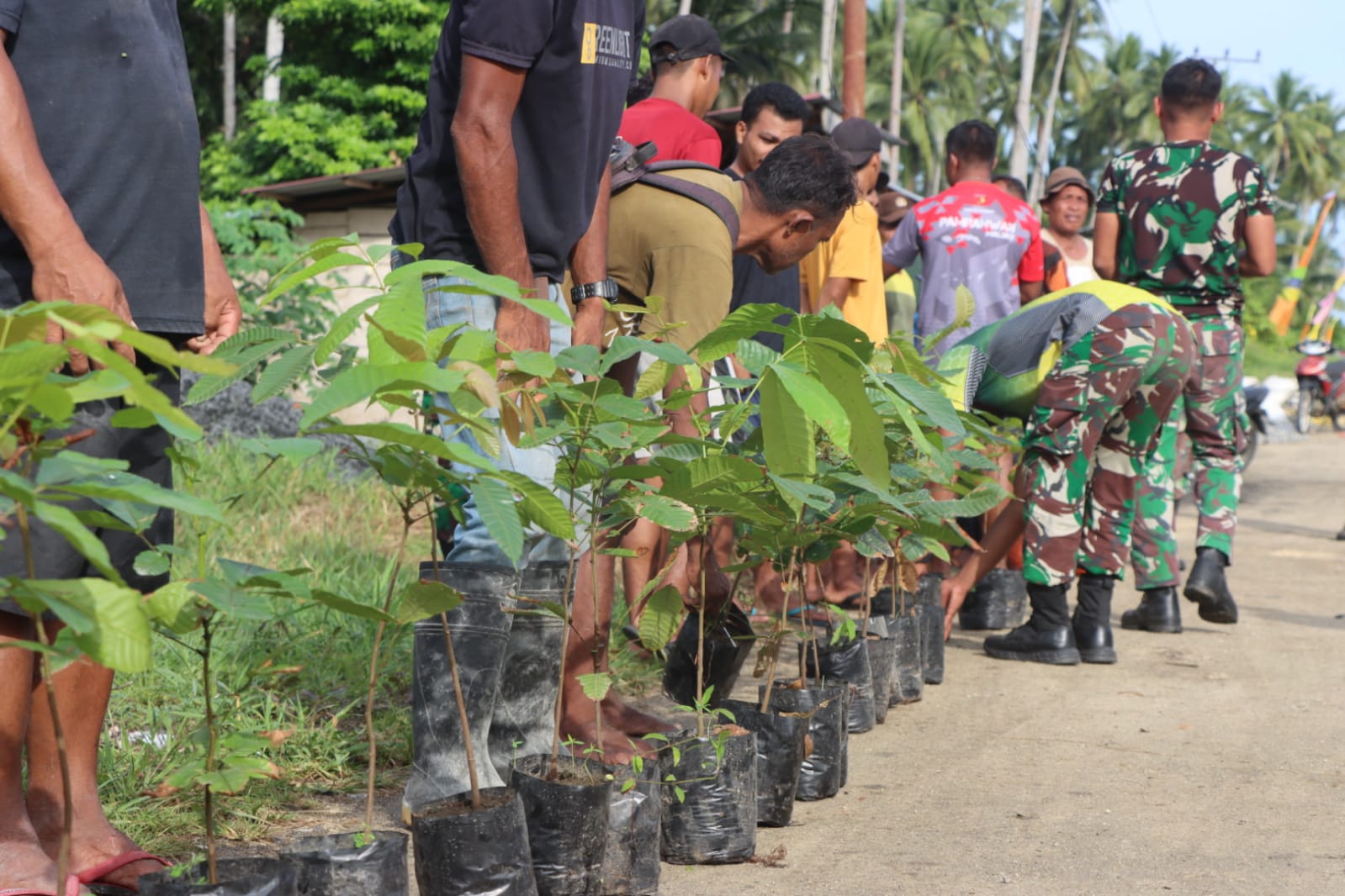 Penanaman pohon dilakukan secara gotong royong oleh personel Satgas TMMD bersama perangkat desa dan warga setempat. Kebersamaan antara TNI dan masyarakat tampak begitu harmonis, mencerminkan semangat kemanunggalan yang menjadi ruh utama dalam pelaksanaan program TMMD.