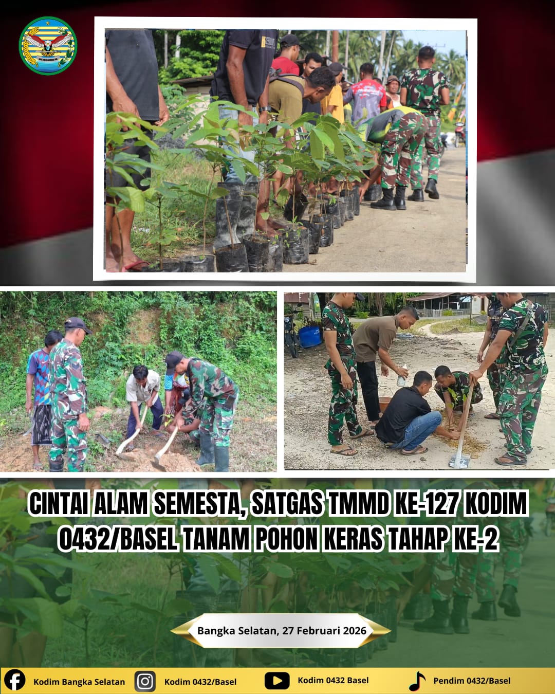 Pulau Lepar, Radarnyamuk.com – Dalam rangka mendukung pelestarian lingkungan hidup sekaligus menyukseskan program TNI Manunggal Membangun Desa (TMMD) Ke-127 Tahun Anggaran 2026, Satgas TMMD Kodim 0432/Bangka Selatan bersama masyarakat melaksanakan kegiatan penanaman pohon sebanyak 300 batang di Desa Penutuk, Kecamatan Pulau Lepar, Kabupaten Bangka Selatan, Jumat (27/02/2026).