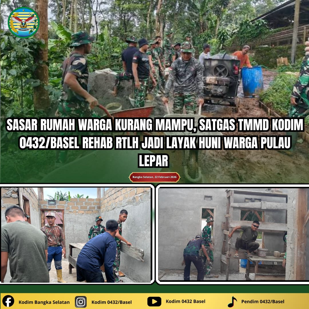 Pulau Lepar, Radarnyamuk.com , — Program TNI Manunggal Membangun Desa (TMMD) ke-127 Tahun Anggaran 2026 yang dilaksanakan Kodim 0432/Bangka Selatan (Basel) terus menunjukkan progres signifikan. Salah satu sasaran fisik yang menjadi prioritas dalam kegiatan tersebut adalah perehaban Rumah Tidak Layak Huni (RTLH) milik warga kurang mampu di Desa Penutuk, Kecamatan Pulau Lepar, Kabupaten Bangka Selatan.