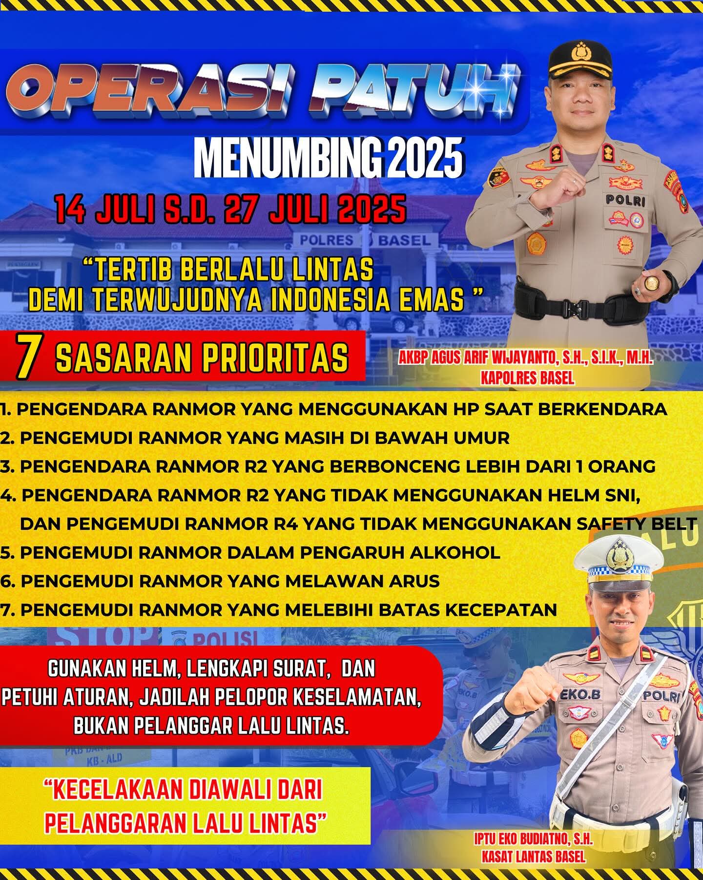 BANGKA SELATAN,Radarnyamuk.com, – Satuan Lalu Lintas (Satlantas) Polres Bangka Selatan akan melaksanakan Operasi Patuh Menumbing 2025 mulai tanggal 14 Juli hingga 27 Juli 2025. Operasi ini merupakan bagian dari kegiatan serentak secara nasional yang digelar guna meningkatkan kesadaran dan kepatuhan masyarakat terhadap peraturan lalu lintas.