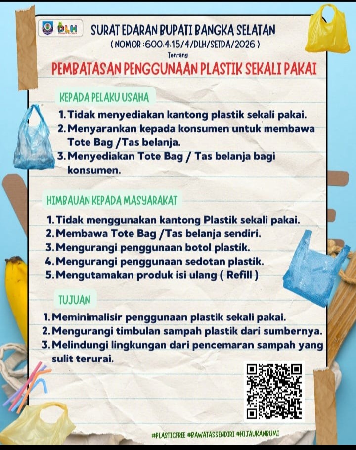 Toboali, Radarnyamuk.com – Pemerintah Kabupaten Bangka Selatan resmi menerbitkan Surat Edaran Bupati Nomor 600.4.15/4/DLH/SETDA/2026 tentang pembatasan penggunaan plastik sekali pakai. Kebijakan ini menjadi langkah strategis dalam menekan volume sampah plastik yang kian meningkat serta mendorong kesadaran masyarakat akan pentingnya menjaga lingkungan.
