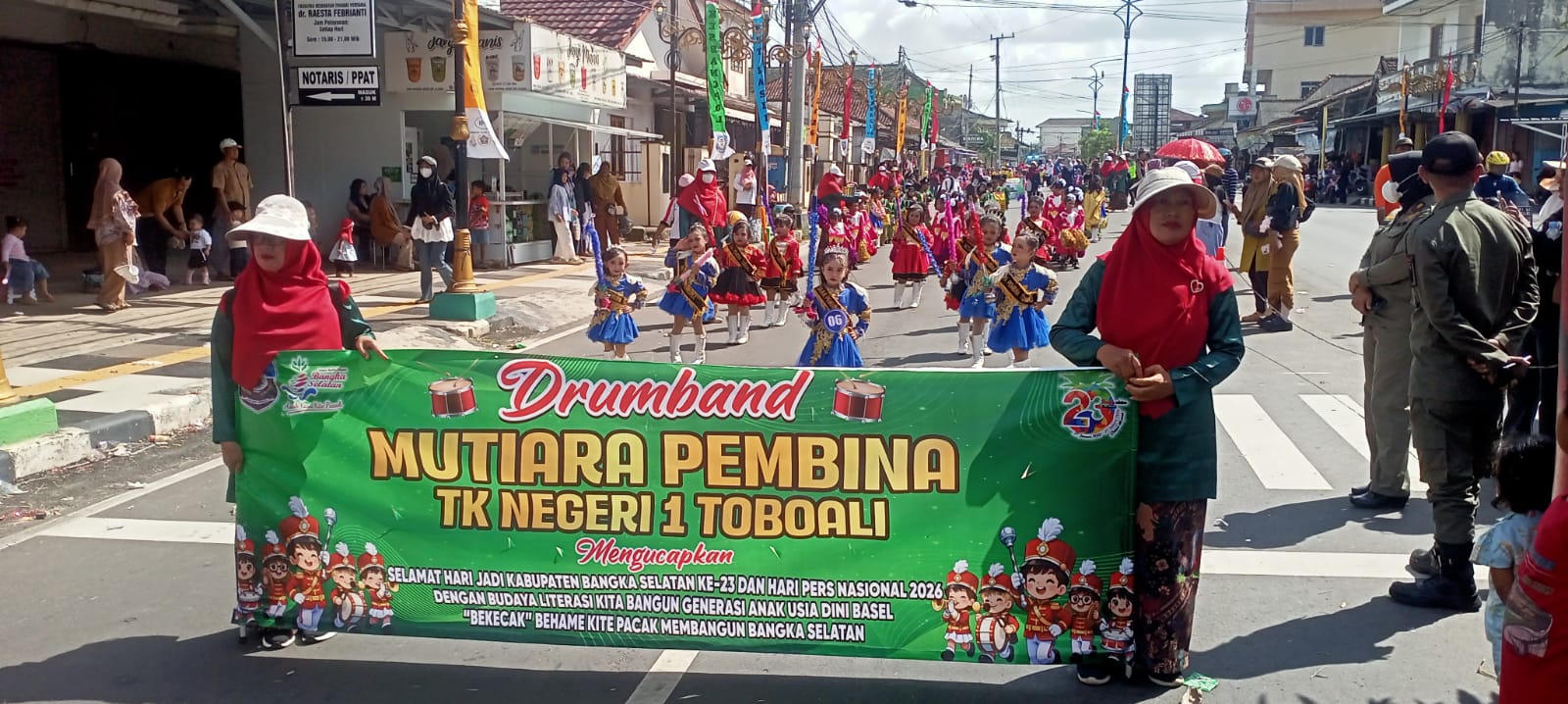 TOBOALI, Radarnyamuk.com , – Dalam rangka memperingati Hari Pers Nasional (HPN) 2026 sekaligus Hari Ulang Tahun (HUT) ke-23 Kabupaten Bangka Selatan, Persatuan Wartawan Indonesia (PWI) Bangka Selatan berkolaborasi dengan Persatuan Drumband Indonesia (PDBI) Kabupaten Bangka Selatan menggelar Street Parade Drumband Tingkat Taman Kanak-Kanak (TK) se-Provinsi Kepulauan Bangka Belitung, Rabu (28/1/2026).