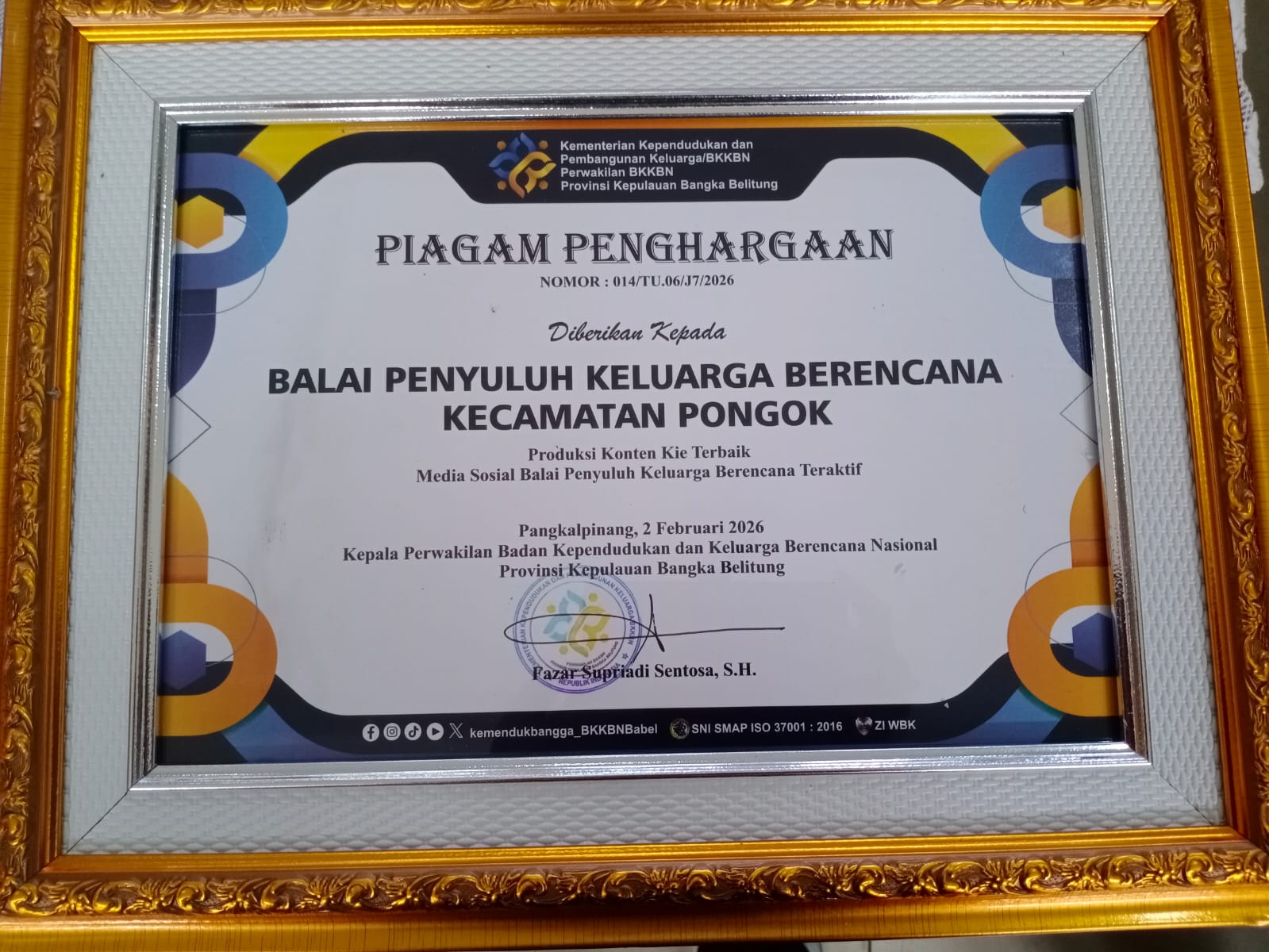 Prestasi juga datang dari tingkat kecamatan, di mana Balai Penyuluhan KB Kecamatan Pongok berhasil meraih penghargaan dalam kategori Konten KIE Media Sosial Terbaik Tahun 2025. Capaian ini menunjukkan bahwa keberhasilan program tidak hanya terjadi di tingkat kabupaten, tetapi juga didukung oleh kinerja optimal hingga ke tingkat bawah.