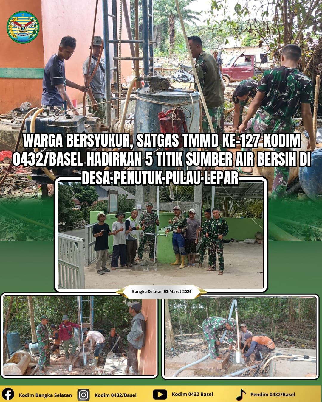 Pulau Lepar, Radarnyamuk.com,-Harapan masyarakat Desa Penutuk, Kecamatan Pulau Lepar, Kabupaten Bangka Selatan, untuk mendapatkan akses air bersih yang layak akhirnya terwujud. Melalui program TNI Manunggal Membangun Desa (TMMD) ke-127 Tahun Anggaran 2026, Satgas TMMD Kodim 0432/Bangka Selatan berhasil menyelesaikan pembangunan lima titik sumber air bersih lengkap dengan sumur bor, tandon air, dan jaringan pipanisasi.selasa(3/3/26)