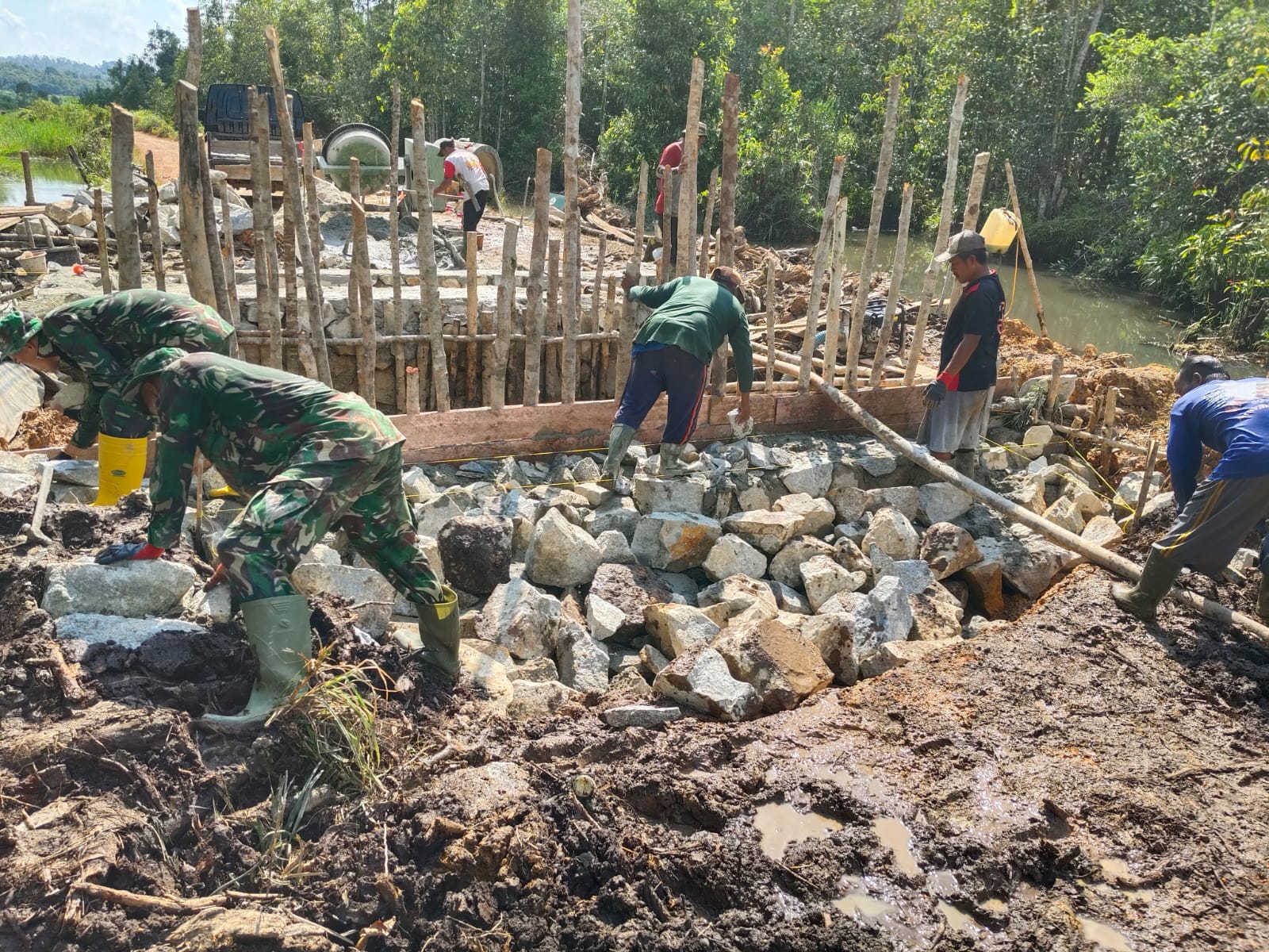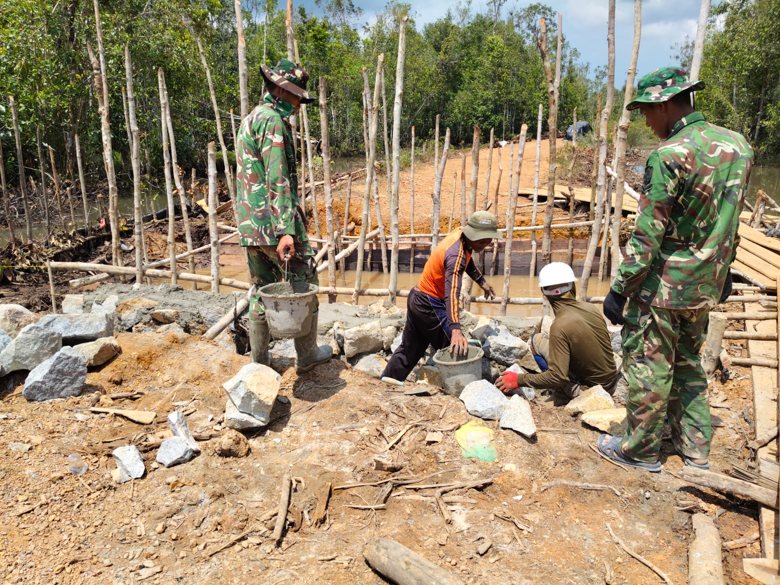 Pembangunan jembatan tersebut melibatkan berbagai unsur, mulai dari Babinsa, personel Batalyon TP 946/DM, hingga masyarakat setempat.
