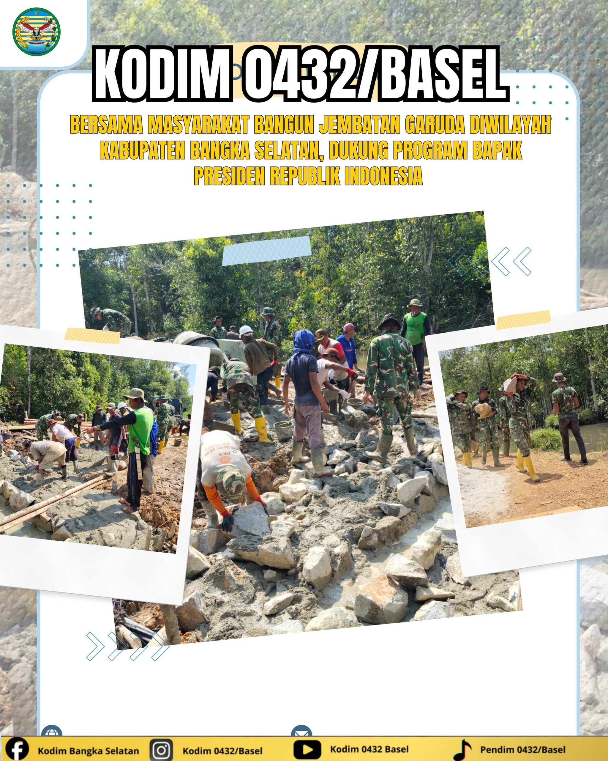 Bangka Selatan, Radarnyamuk.com – Kodim 0432/Bangka Selatan bersama masyarakat melaksanakan pembangunan jembatan di wilayah Kabupaten Bangka Selatan, tepatnya di Kecamatan Payung dan Kecamatan Toboali, Selasa (14/04/2026).